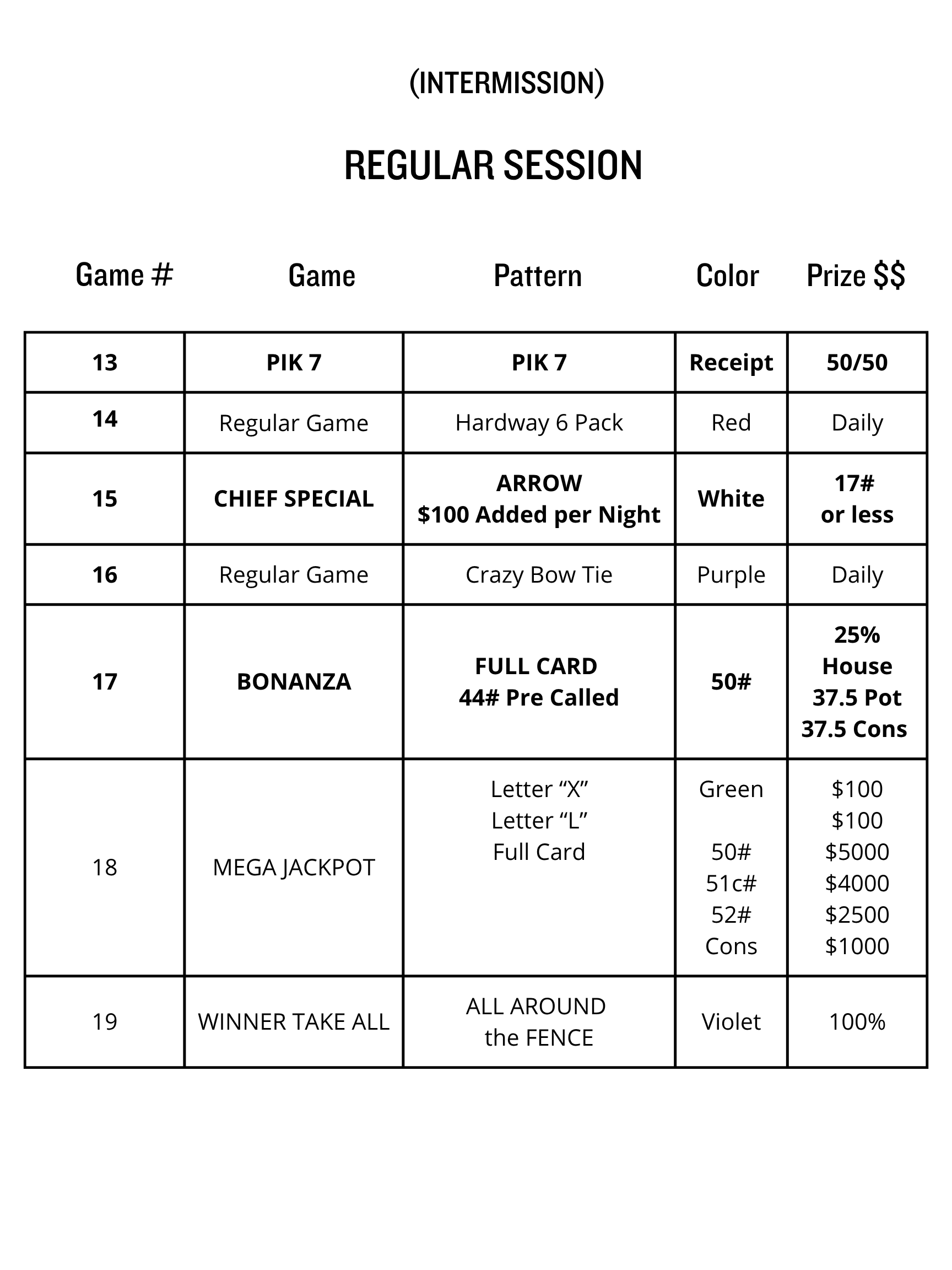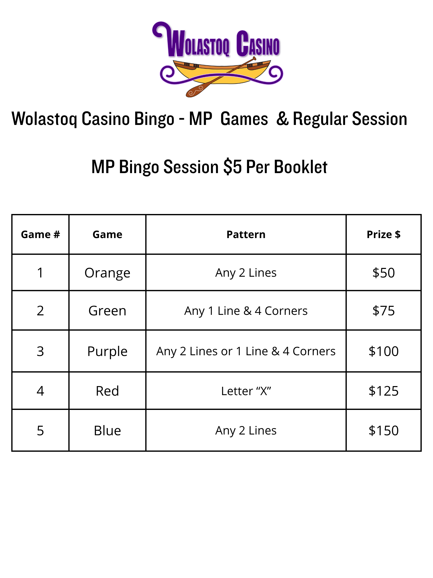 MP Bingo 6:30 pm – Regular Games 7:00 pm